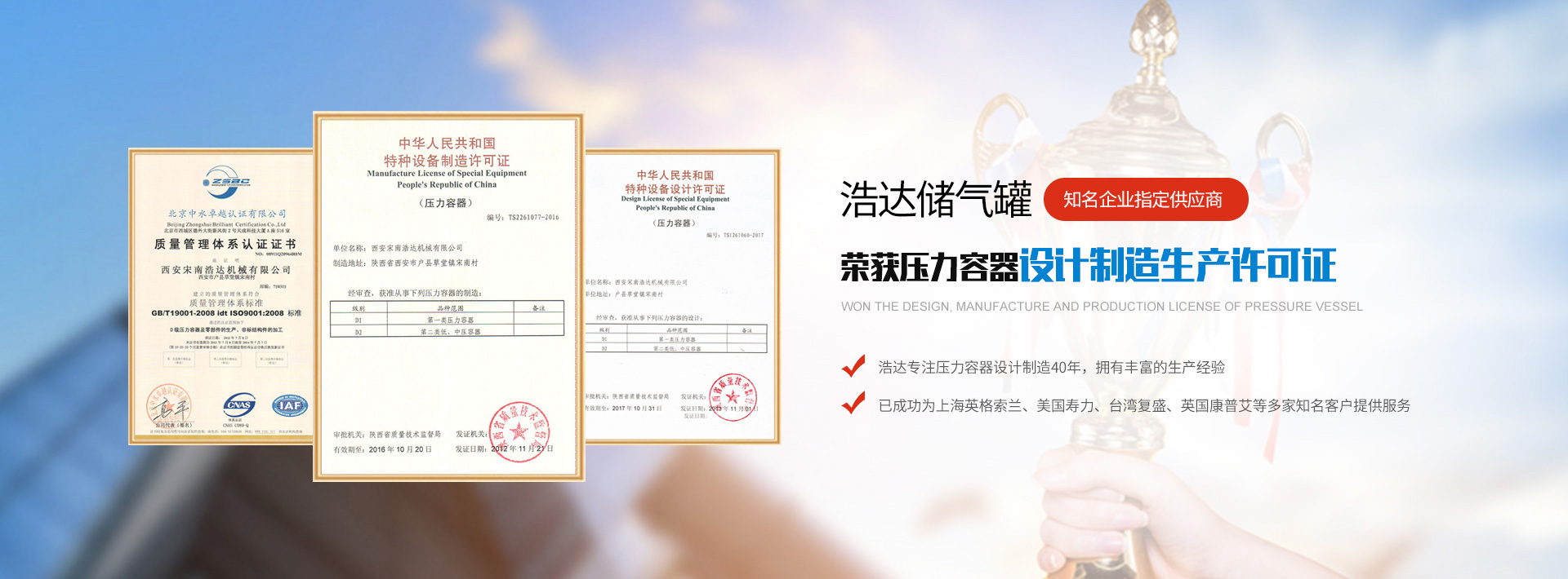 現(xiàn)有壓力容器/不銹鋼儲氣罐設(shè)計、制造、C級鍋爐生產(chǎn)許可證,是部級先進(jìn)企業(yè),省級安全生產(chǎn)單位,市級標(biāo)準(zhǔn)化先進(jìn)企業(yè),市級重合同、守信譽(yù)單位,二級計量企業(yè)。
